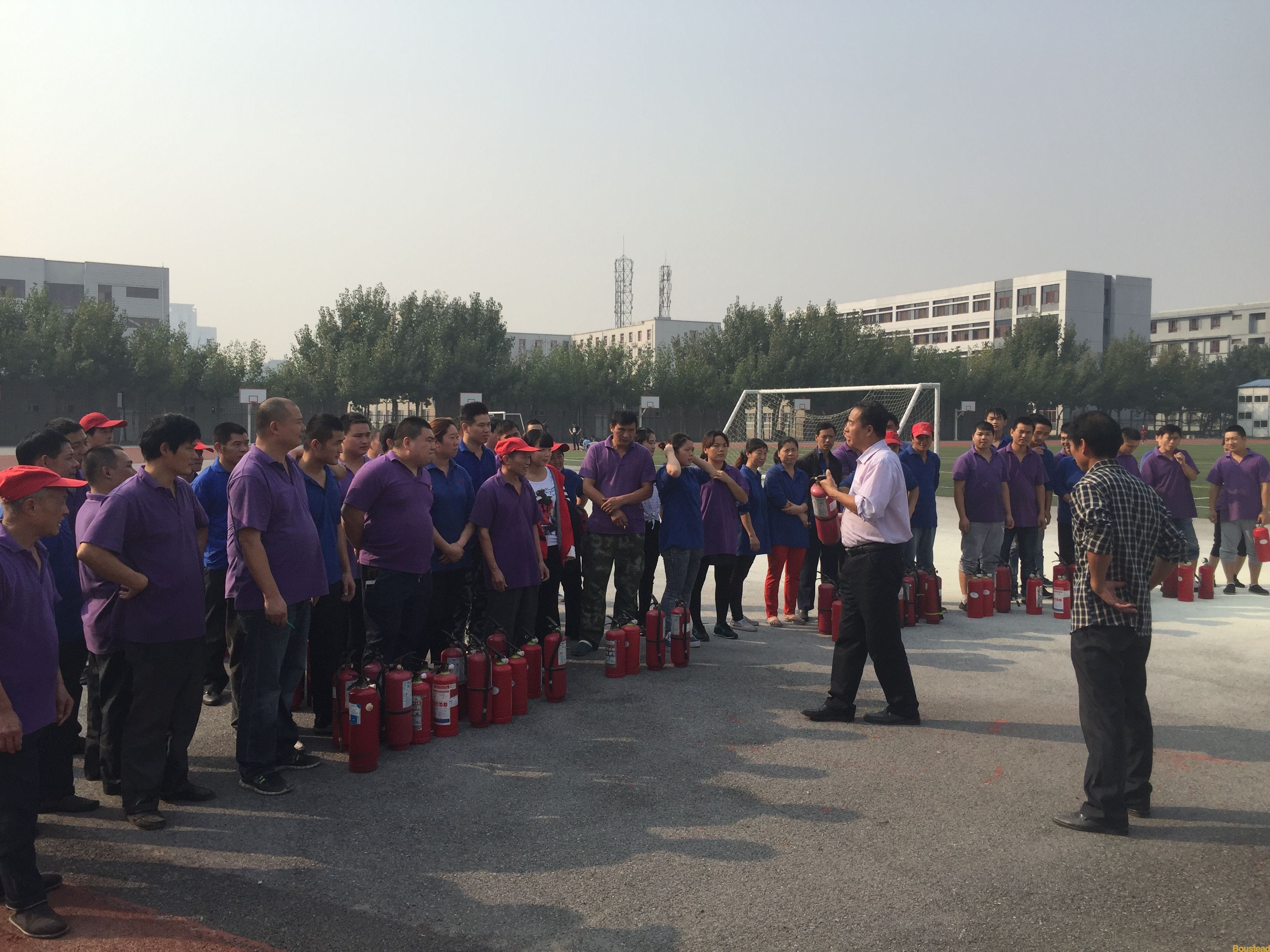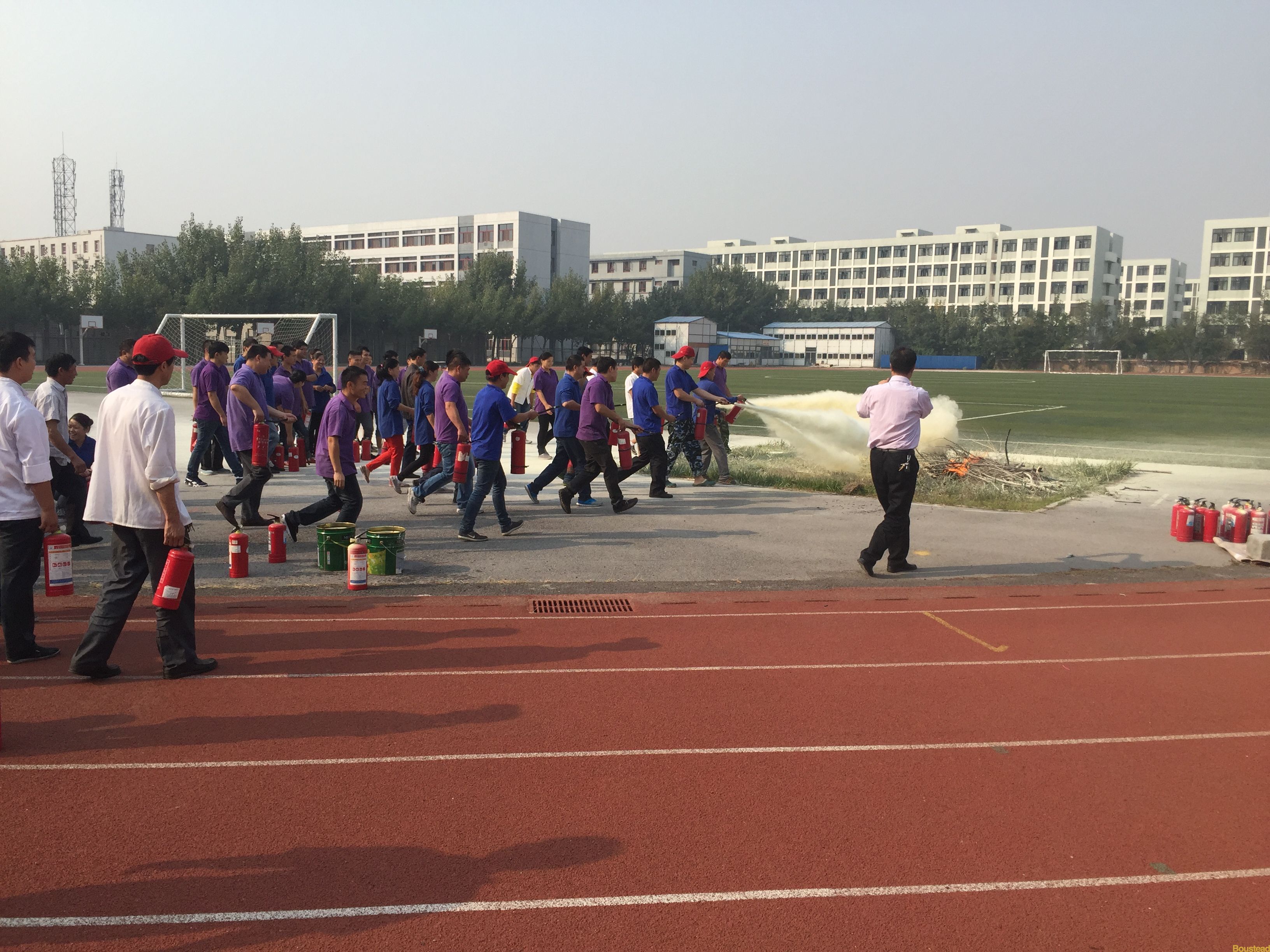 为进一步强化学院食堂员工的消防安全意识,提高突发事件的应变能力,使食堂员工在火灾发生时掌握火灾现场逃生自救方法以及正确掌握灭火器使用技巧,安全保卫部、综合保障部联合于2015年10月15日14:00点,在学院大操场开展了消防演练活动。首先由安全保卫部王建国副主任对参练员工进行理论知识培训,就常用灭火器的适用范围、使用方法、操作要领和注意事项进行了详细的讲解和操作示范。随后是紧张的灭火演练,员工们在听完讲解后跃跃欲试,按照要求逐个实际操作演练,真正体验了一次火灾的扑救全过程。