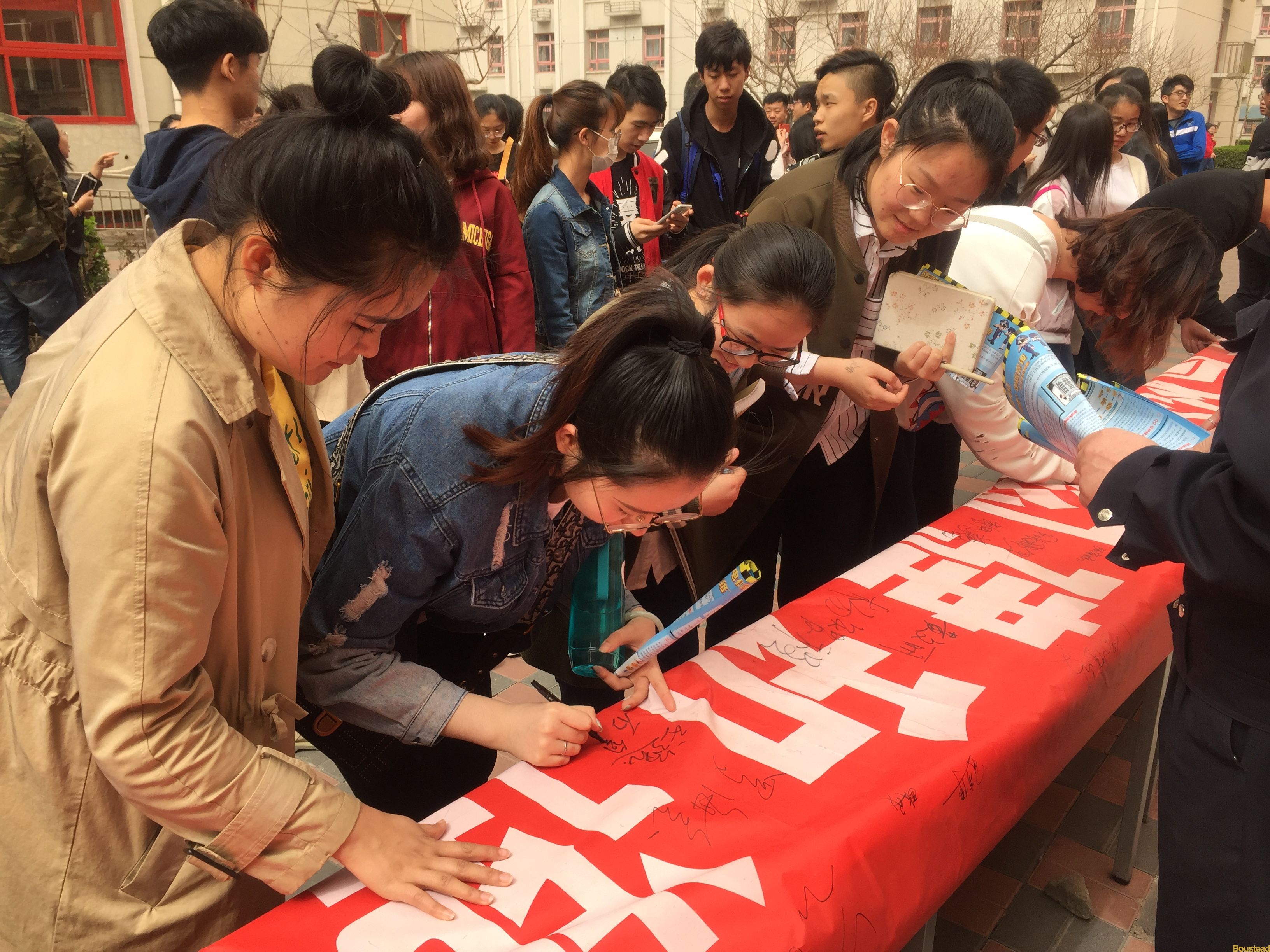 活动现场,气氛热烈活泼,学院师生与公安西青分局学苑派出所驻校民警热情互动,宣传了平安校园建设的政策措施,讲解了安全知识,介绍了邪教组织的危害性和腐蚀性,发放了防范诈骗宣传单。期间,师生共同在布标上签字留言,表达了对平安校园建设的期许。学院党委书记、院长朱世和也赶到活动现场,在布标上签字留言。