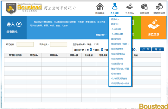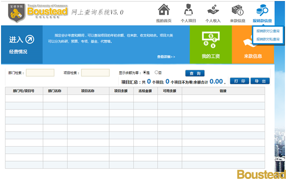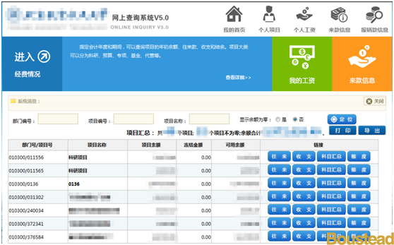 点击“个人项目”,下方显示当前登录的教师所负责的项目经费情况,单击每个项目行的往来、收支、科目汇总、额度链接可以查询该项目的借款还款情况、收入支出情况、科目汇总和额度信息。