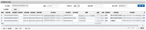 对公查询中,指定对方单位(此处对方单位名称须输入完整、正确的全称)或账号、交易状态(成功、失败)、 起止日期等条件后单击“查询”按钮即可得到查询结果。
