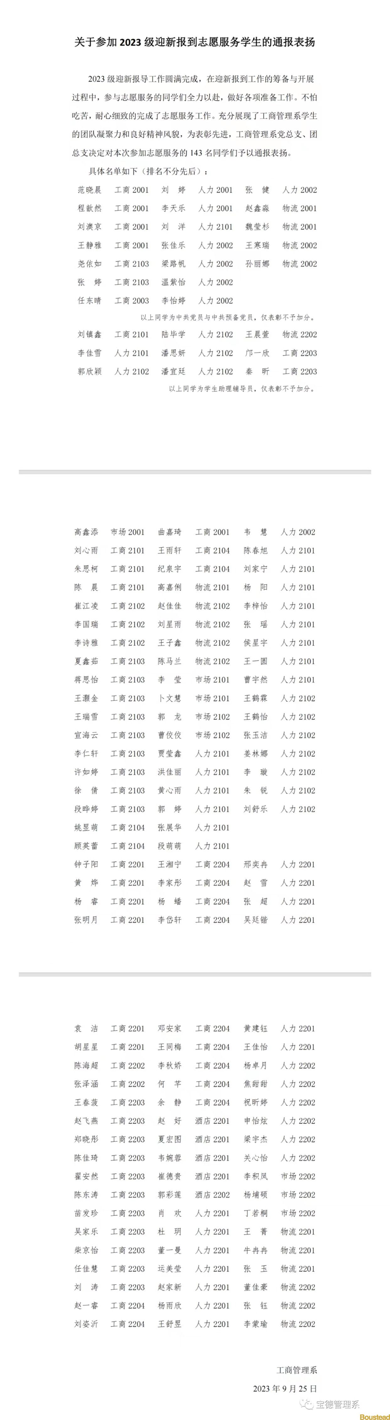 关于参加 2023 级迎新报到志愿服务学生的通报表扬