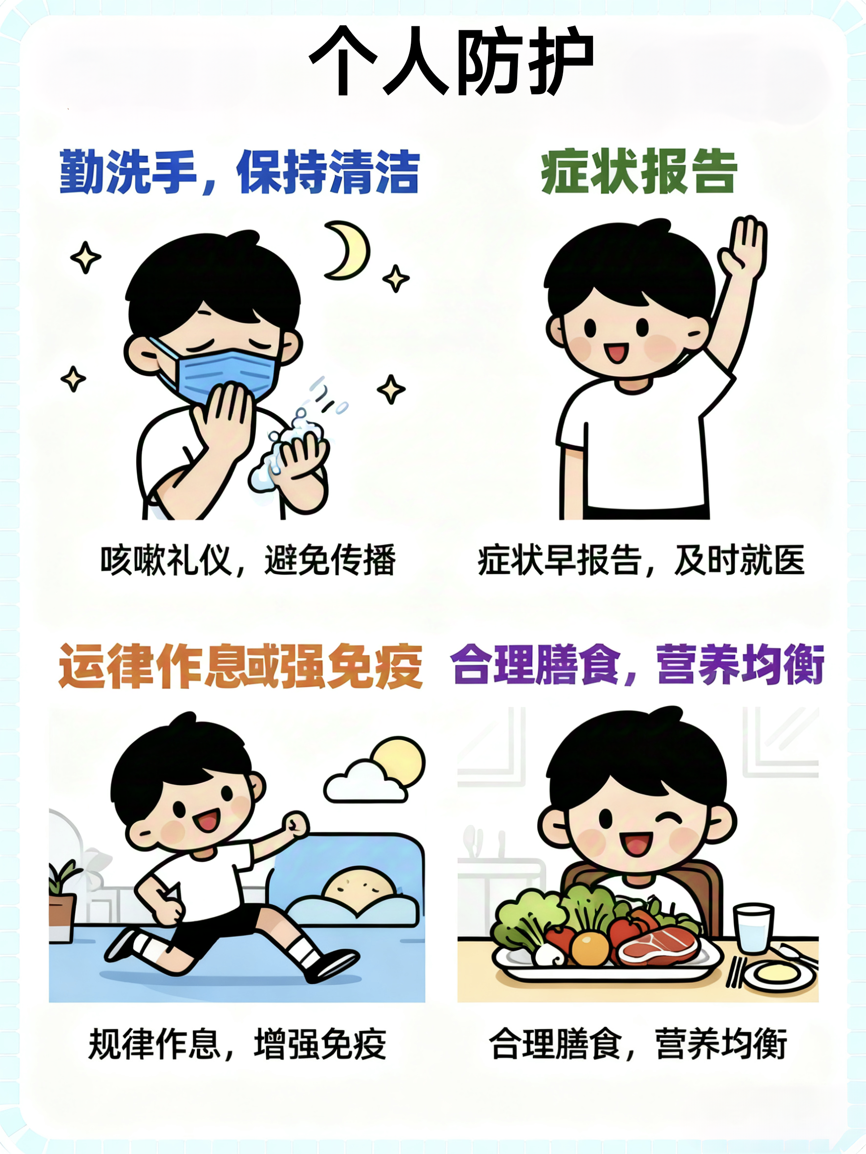 校园内人员密集,加上季节交替,气温波动显著,容易引发流感、水痘等呼吸道传染病的传播。为保障校园内同学们的健康,降低传染病传播风险,提供以下实用防护建议。
