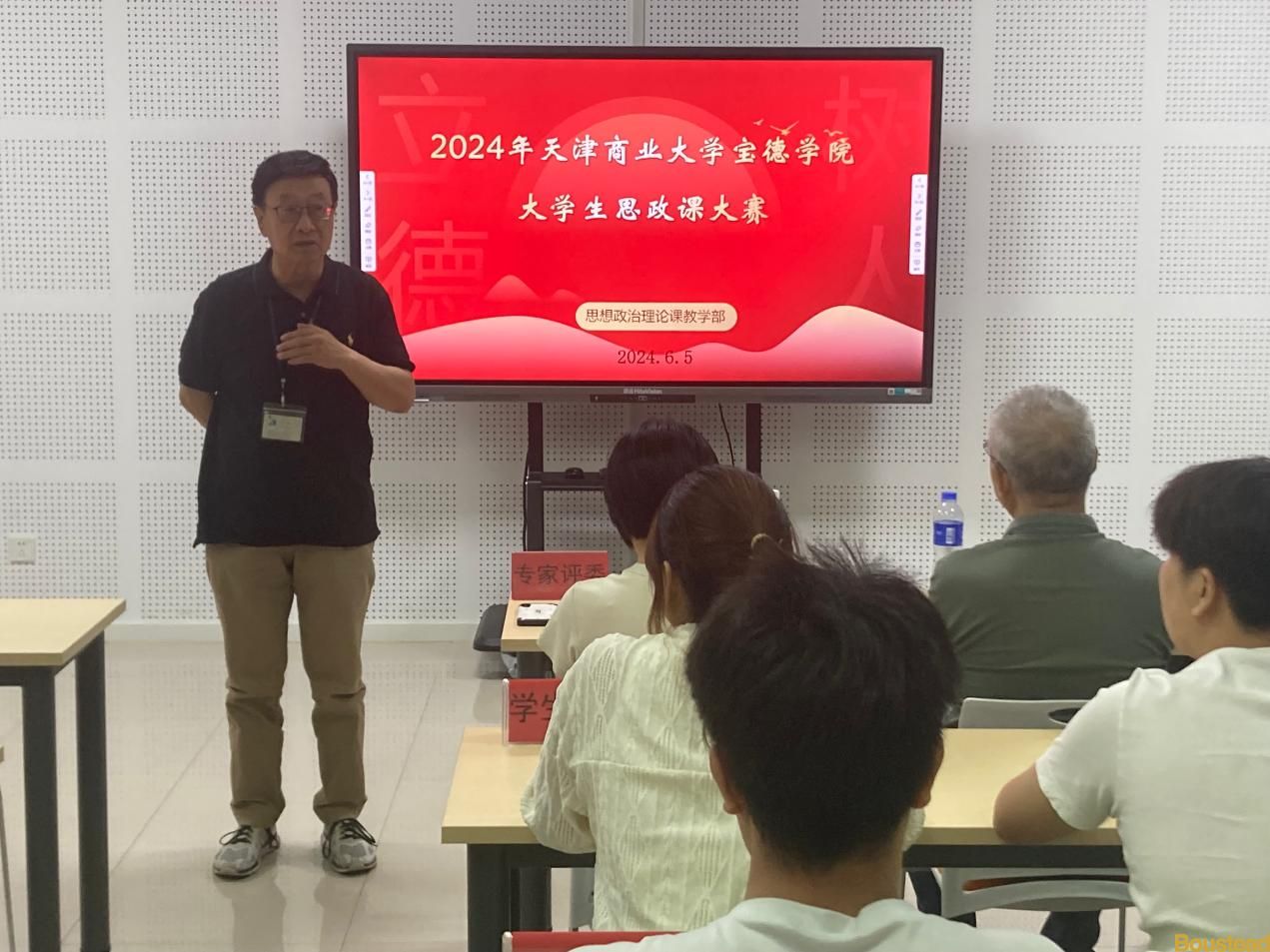为深入贯彻落实习近平新时代中国特色社会主义思想,切实铸魂育人,引导大学生通过讲、思、悟,进一步增强对思政课的获得感,提升思想政治理论课的吸引力和感染力,思想政治理论课教学部举办2024年天津商业大学宝德学院大学生思想政治理论课公开课大赛,学院党委书记曹军、思想政治理论课教学部主任初明利、基础课教学部副主任王天宝出席比赛,部分教师担任专家评委。