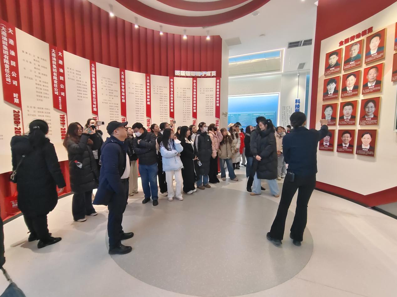 在讲解员引导下,师生依次参观“驰梦之旅”“燃情岁月”“记忆不朽”等主题展区,通过珍贵文物、历史档案与影像资料,全景式了解大港五井油田从艰苦创业到技术攻坚的发展历程。展陈中呈现的实干精神、奉献品质和创新力量,使师生对“为国找油、为国担当”的石油精神有了更为直观和深刻的体悟。