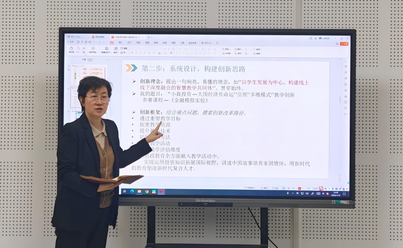 分享会上,樊宇老师强调,教学创新大赛的核心逻辑是“问题导向、科学创新、成果落地、辐射推广”,所有创新需源于真实教学痛点,以扎实理论为支撑,用实证成果体现价值。她系统拆解了构建教学创新的四大核心环节:通过多元问卷调查开展学情分析,精准挖掘知识技能、学习能力等方面的教学痛点;确立清晰创新理念与框架,贯穿教学目标、内容、方法、技术、评价全流程,她以自身《金融模拟实验》课程为例,以“小我投资-大国经济共命运”为引领,构建“多维模式”教学创新;布局创新举措,形成“思路-举措-成效”逻辑闭环,通过模块化知识体系构建、混合式教学等方法,借助数字平台与智慧工具赋能教学,建立过程性评价体系;用“证据链”呈现成效,通过量化数据与质性材料展现学生能力提升,以教改成果与资源共享凸显辐射价值。此外,樊宇老师还分享了课堂实录视频、创新报告、现场汇报等材料的打磨技巧,强调团队协作与案例学习的重要性。