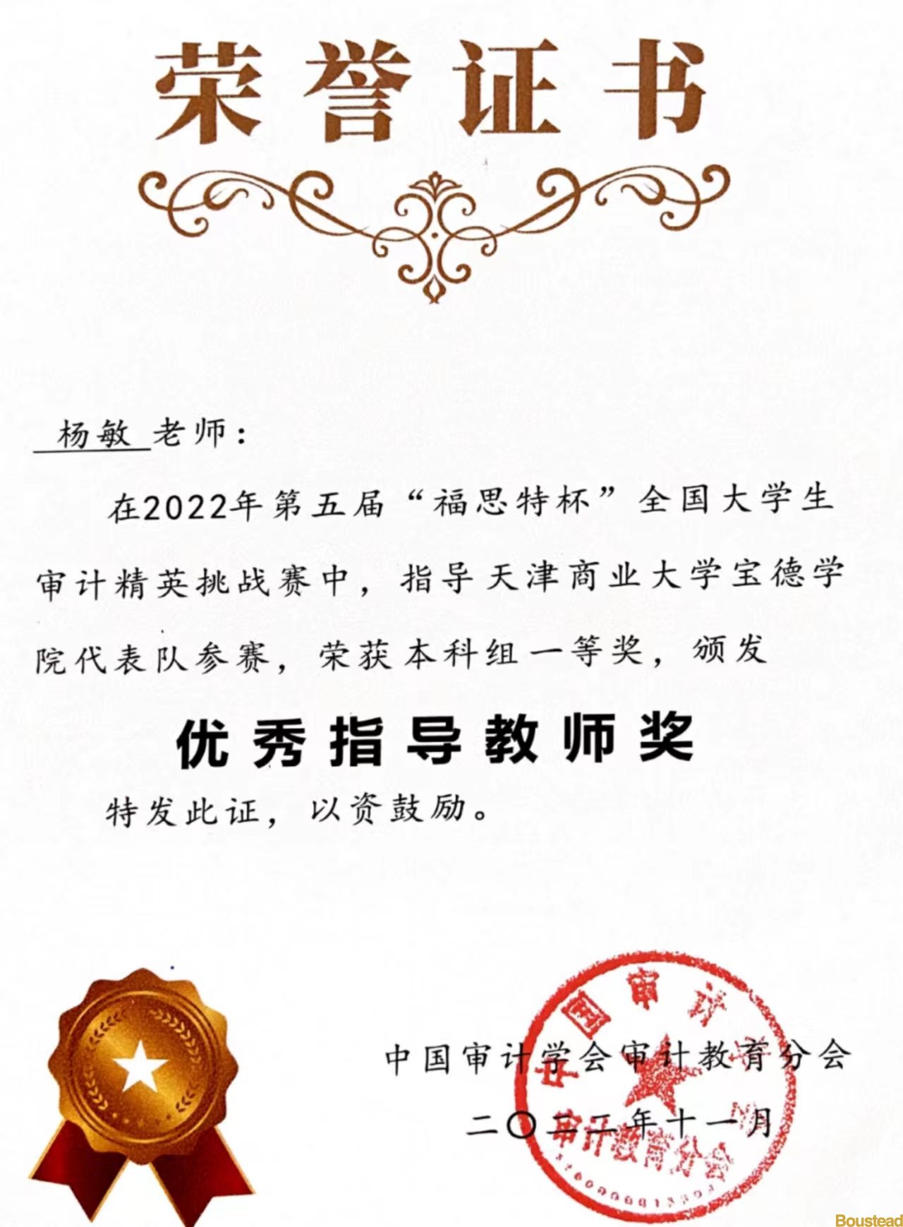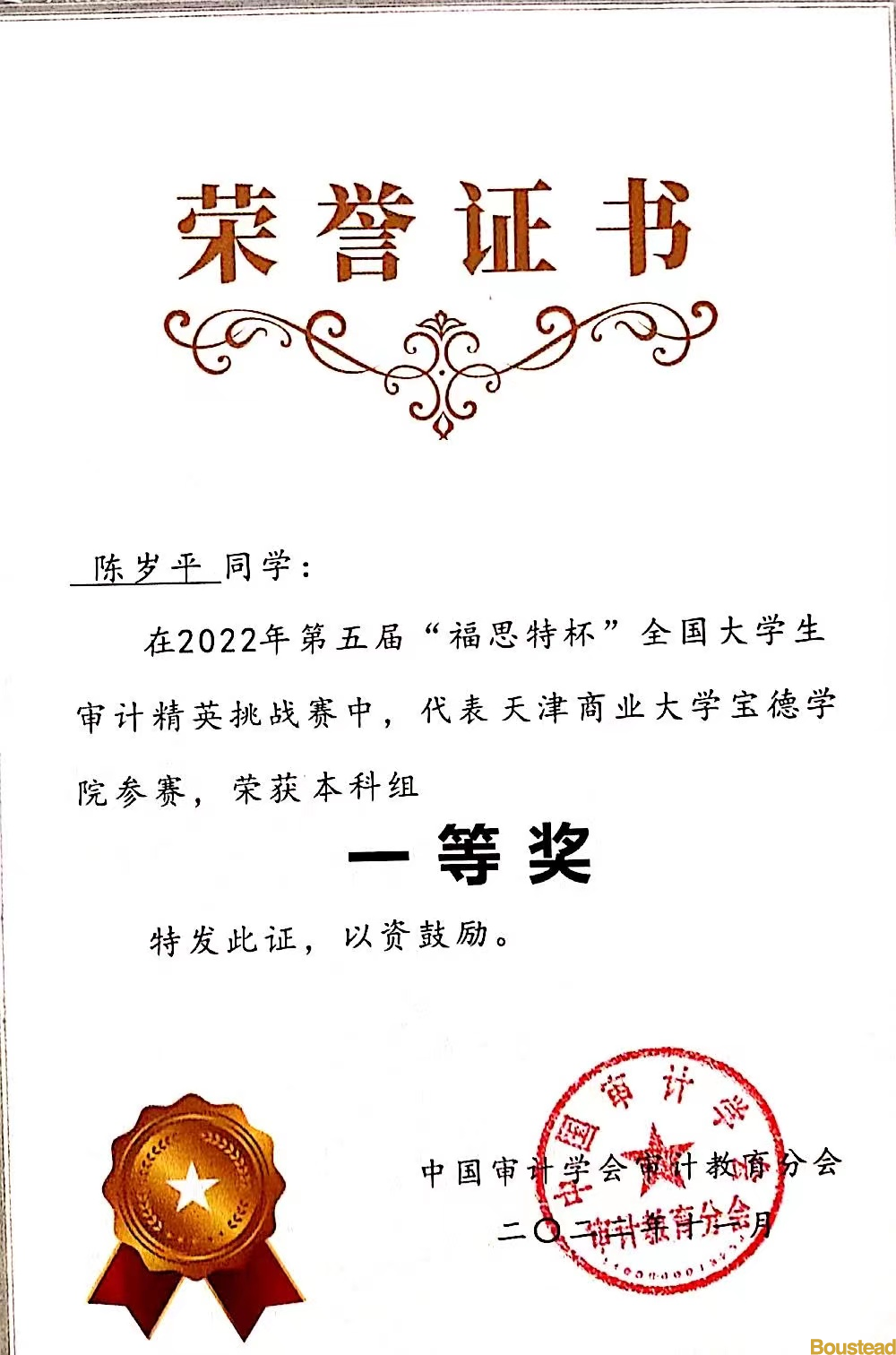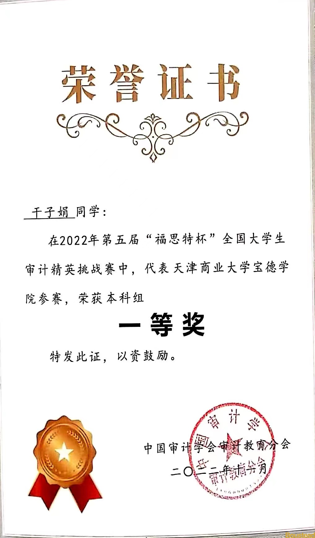 我系学子:审计1901班陈岁平、审计1902班张衡、干子娟三位同学组成的我院代表队,成绩优异,荣获2022年第五届“福思特杯”全国大学生审计精英挑战赛本科组“一等奖”。