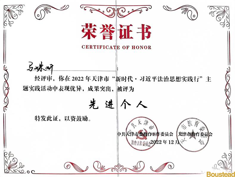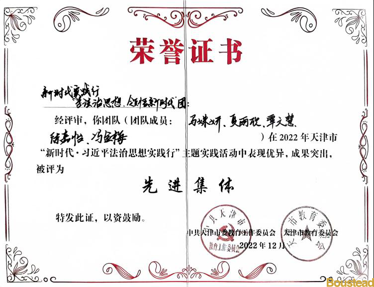 天津市习近平法治思想实践行主题活动“先进个人”、“先进集体”;
