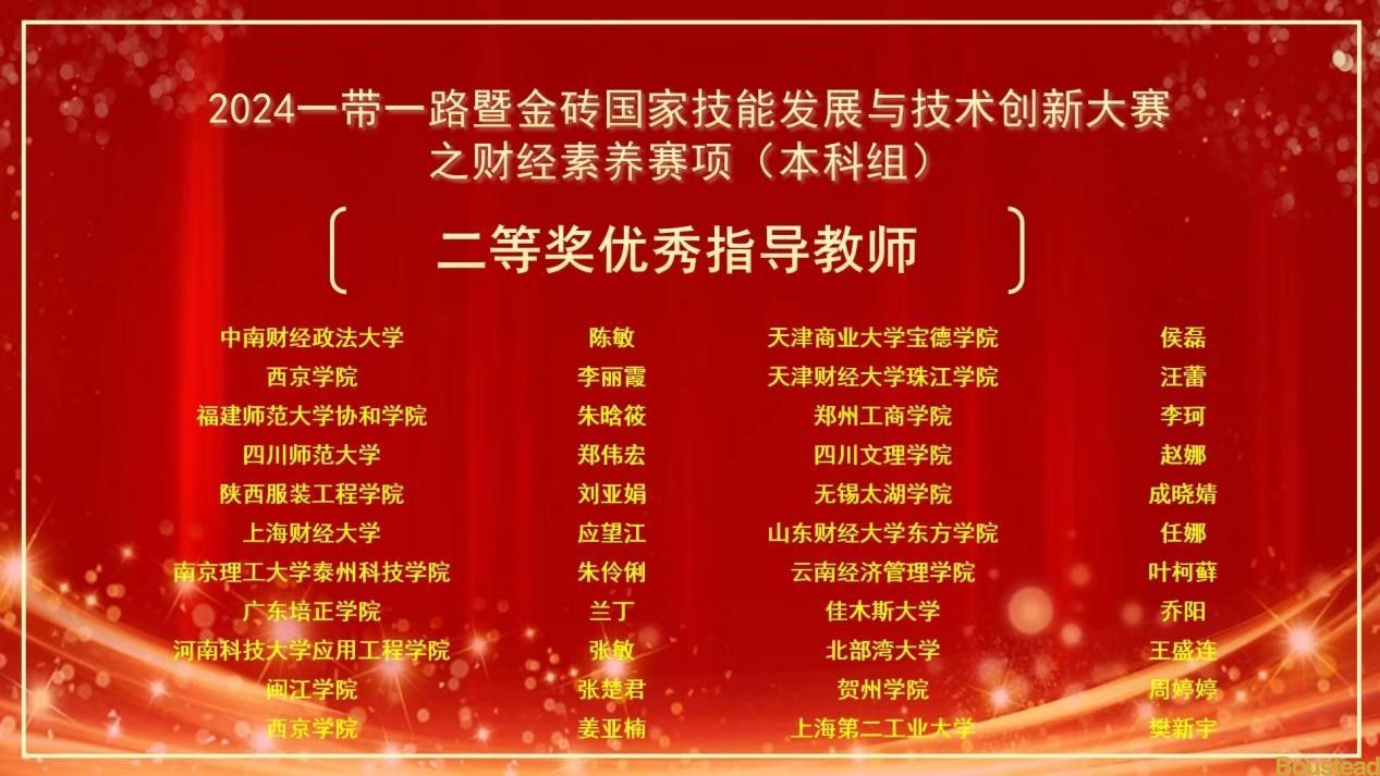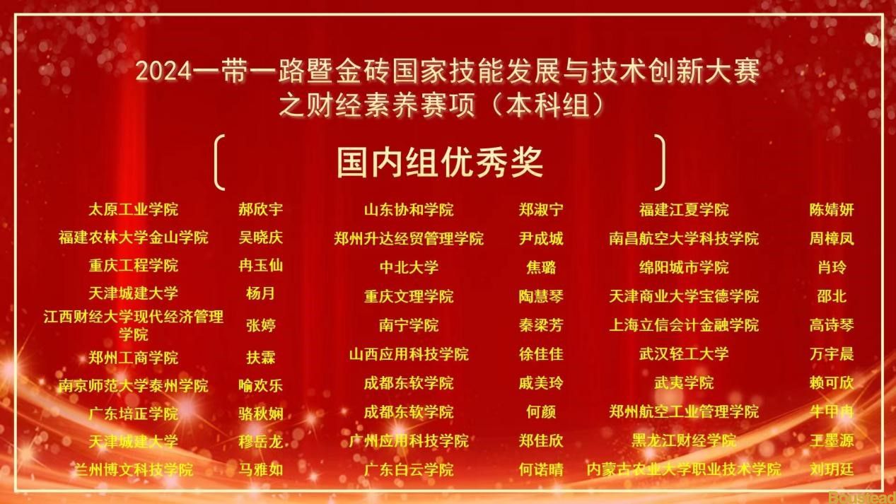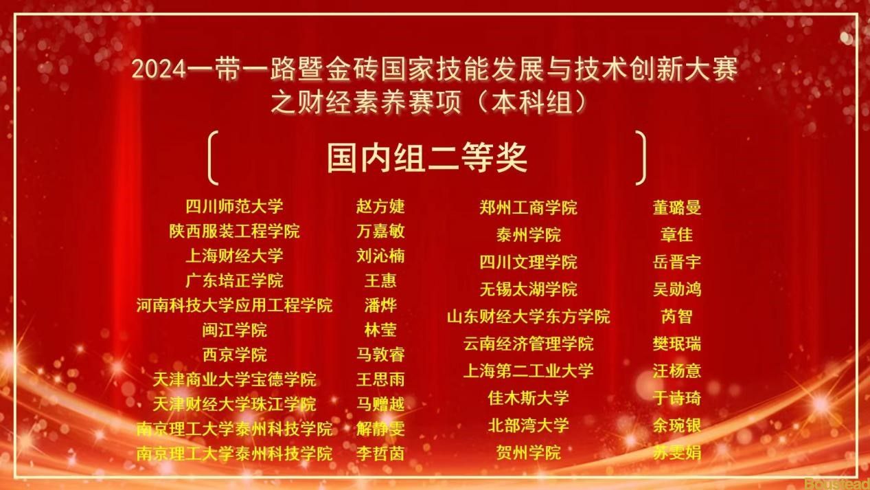 经过激烈的角逐,王思雨同学获2024一带一路暨金砖国家技能发展与技术创新大赛之财经素养赛项(本科组)“国内组二等奖”;邵北同学获2024一带一路暨金砖国家技能发展与技术创新大赛之财经素养赛项(本科组)“国内组优秀奖”;侯磊老师获2024一带一路暨金砖国家技能发展与技术创新大赛之财经素养赛项(本科组)“二等奖优秀指导教师”;天津商业大学宝德学院获2024一带一路暨金砖国家技能发展与技术创新大赛之财经素养赛项(本科组)“优秀组织奖”。