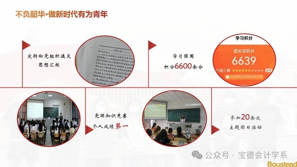 在扎根专业学习外,她坚持课赛融合,双创实践,追求全面发展,大胆尝试,挖掘更多可能。创新创业类竞赛、专业技能类竞赛、数学建模竞赛、职业规划大赛等诸多赛场上,她始终携着初心与热情,全力以赴。共计获38项荣誉,包括国家级奖项2项、市级奖项11项、校级奖项25项。会计学系曾对她进行学霸访谈报道——知不足而奋进,望远山而前行,发布至系公众号,阅读量800+。她以负责人或队长身份多次带领团队取得荣誉。2024年,所负责项目《“蔗”里——以绿色产品赋能乡村振兴》成功市级立项;项目《红旅“清废先锋”——甘蔗渣的高效处置赋能乡村振兴》获中国国际大学生创新大赛(2024)天津赛区红色筑梦之旅赛道铜奖。