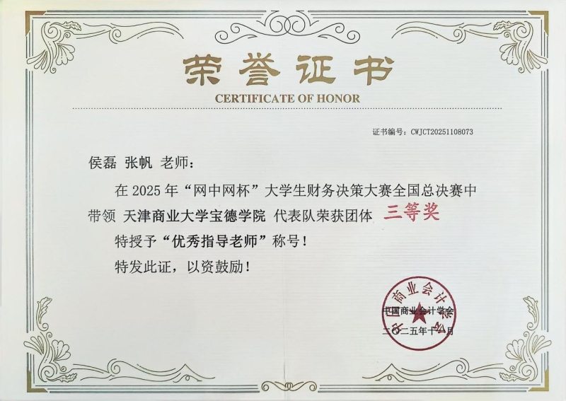 当前,企业数字化转型已成为必然趋势,而数字化经营管理与决策能力的培养,也成为高校教育教学的重要课题。2025年11月8日,由中国商业会计学会主办,大连财经学院承办,厦门网中网软件有限公司、厦门网中网教育科技有限公司、北京东大正保科技有限公司、正保会计网校支持的第十三届“网中网杯”大学生财务决策大赛全国总决赛于辽宁大连圆满收官。作为全国普通高校学科竞赛排行榜赛项,本届“网中网杯” 大学生财务决策大赛,受到院校的广泛关注和积极响应。自8月启动以来,历经校级选拔、区域突围,最终从全国600余支队伍中脱颖而出54支代表队入围总决赛。经过激烈角逐,天津商业大学宝德学院荣获“团体三等奖”,会计学系会计教研室主任侯磊老师、财务管理教研室张帆老师荣获“优秀指导老师”荣誉称号。
