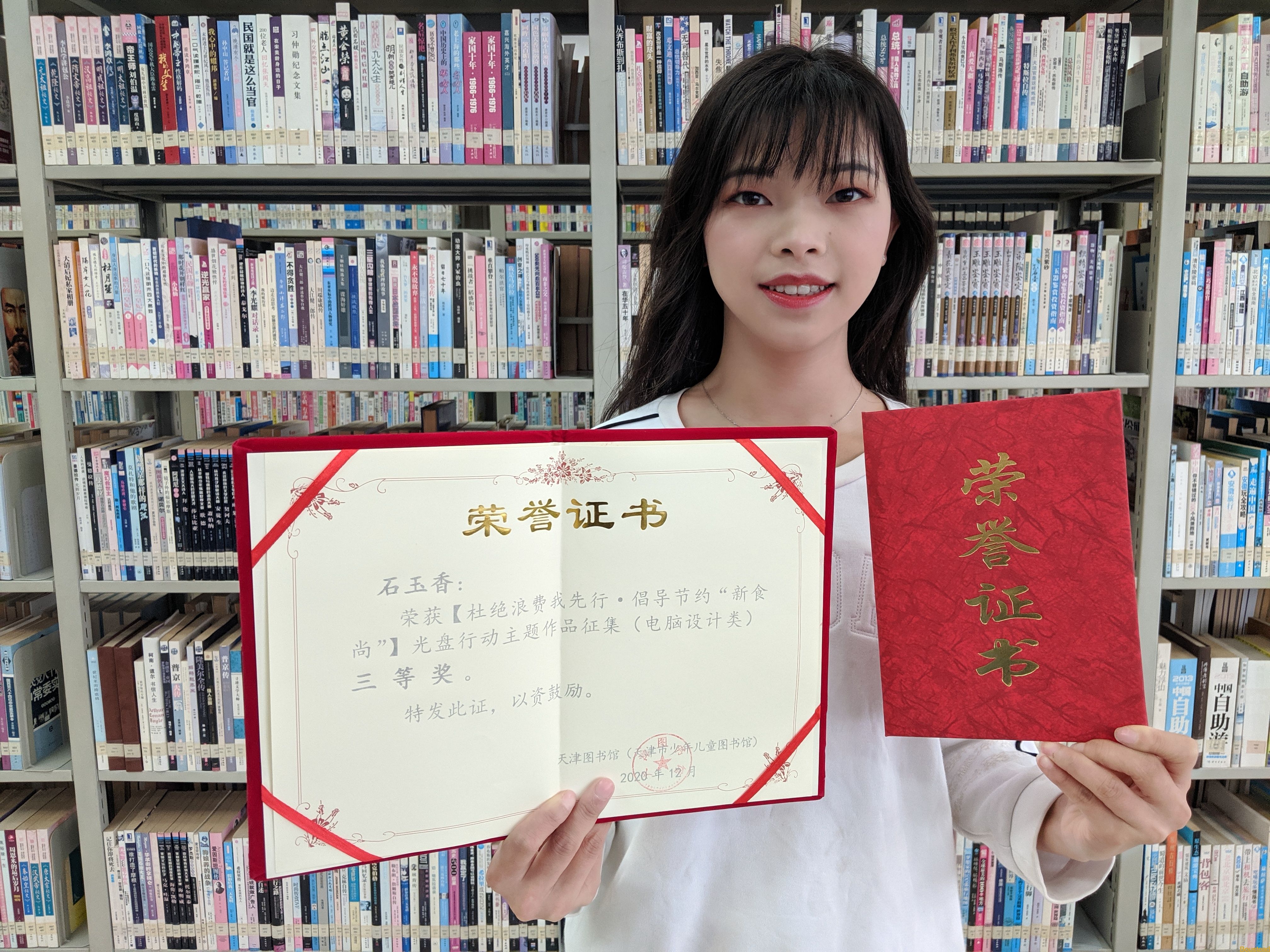 石玉香同学在参加图书馆组织参与的天津市杜绝浪费我先行·倡导节约“新食尚”创意作品征集活动中荣获电脑设计类三等奖。