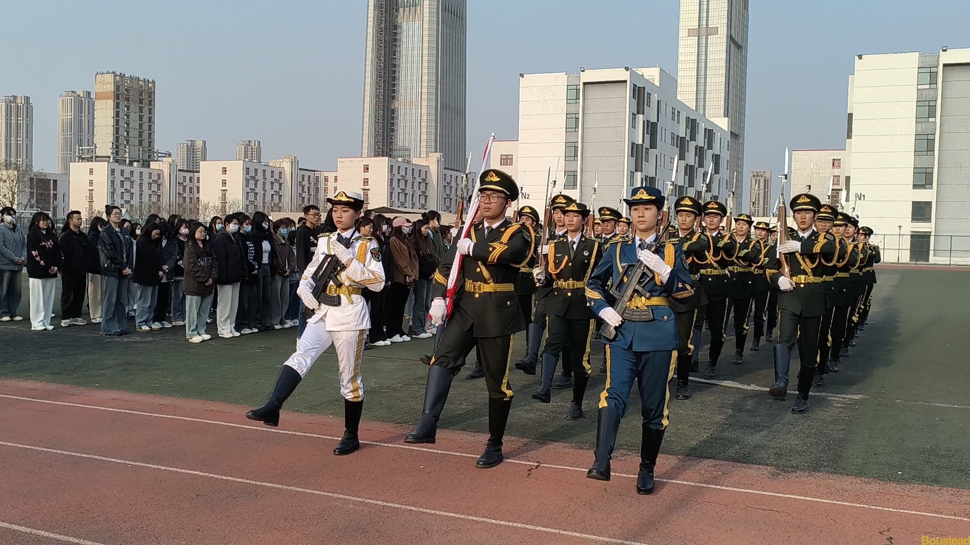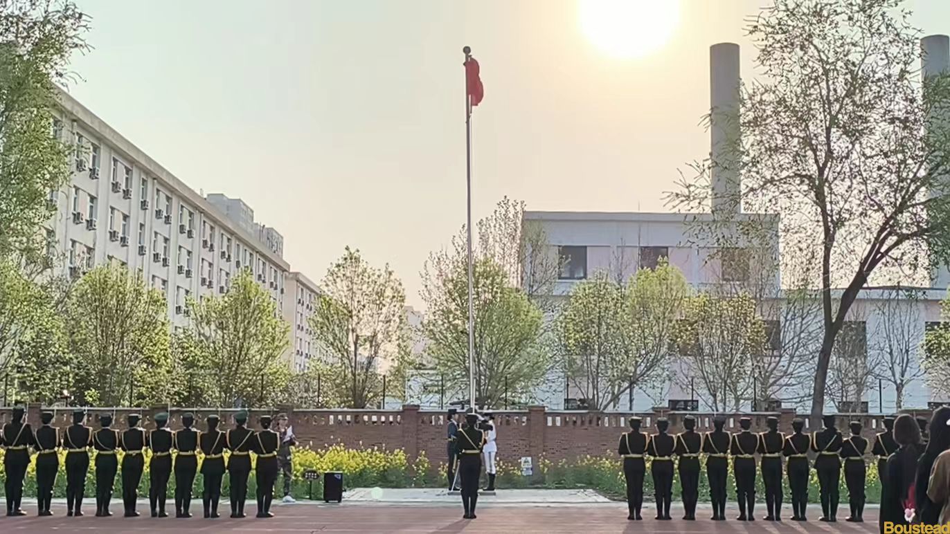 第一项议程:迎国旗、升国旗7点30分,升旗仪式正式开始。国旗护卫队迈着整齐的步伐护卫五星红旗登上升旗台,伴随着庄严的国歌,五星红旗迎风飘扬,沐浴着清晨的朝阳冉冉升起,全体师生目光紧紧追随着那飘扬的红旗,庄严而肃静,与国旗一同升起的还有全体师生对英烈的敬仰和对未来的期待。