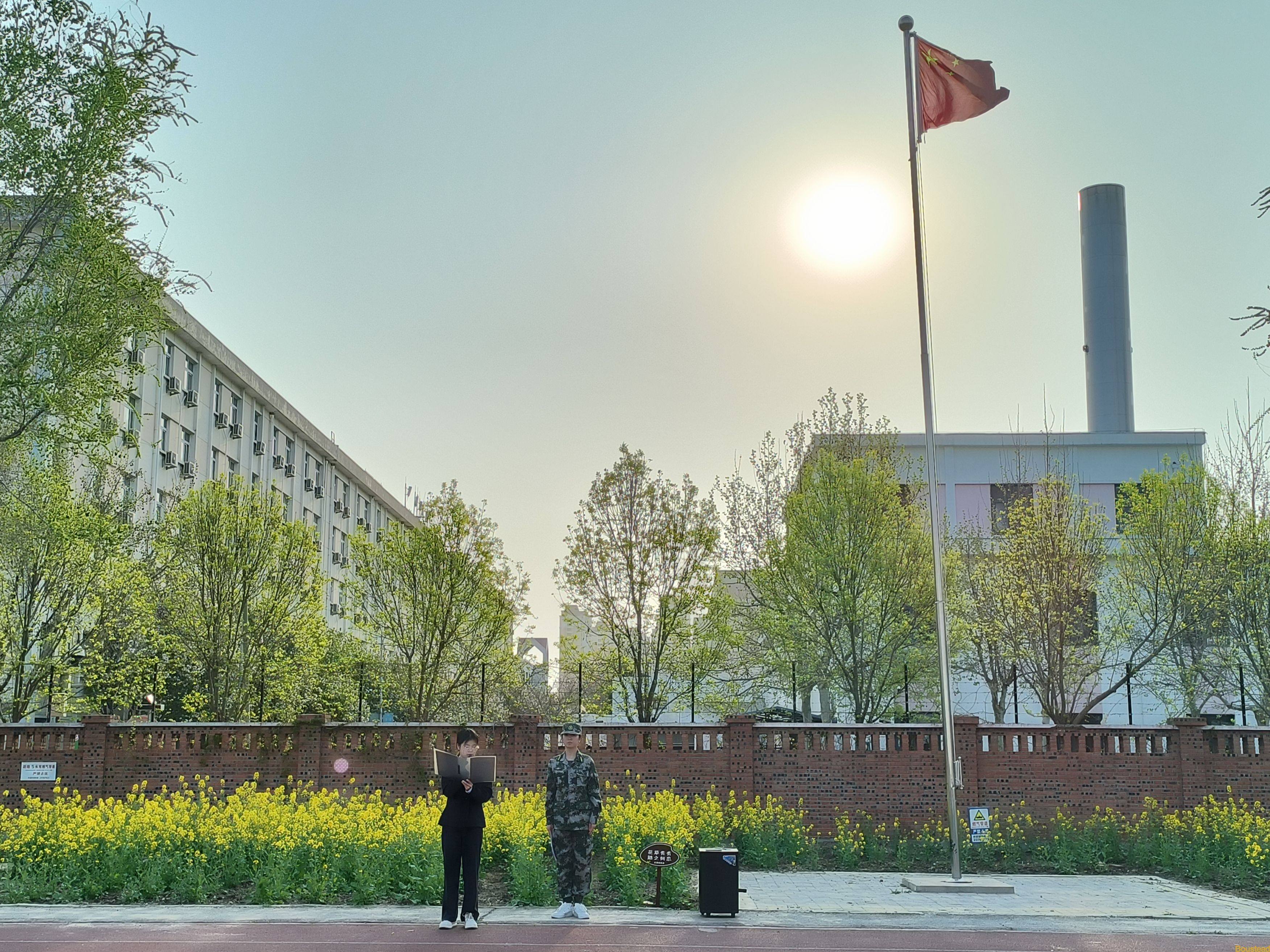 7点30分,升旗仪式正式开始。国旗护卫队迈着整齐的步伐护卫五星红旗登上升旗台,伴随着庄严的国歌,五星红旗迎风飘扬,沐浴着清晨的朝阳冉冉升起,全体师生目光紧紧追随着那飘扬的红旗,庄严而肃静,与国旗一同升起的还有全体师生对英烈的敬仰和对未来的期待。