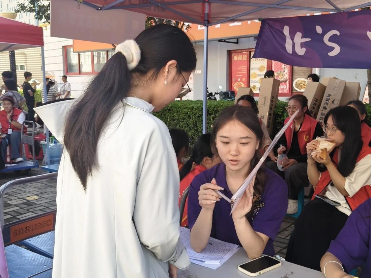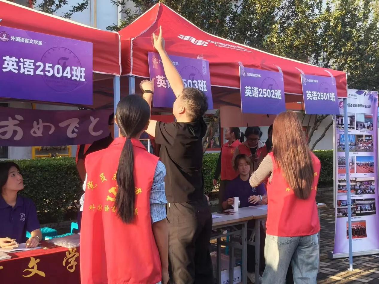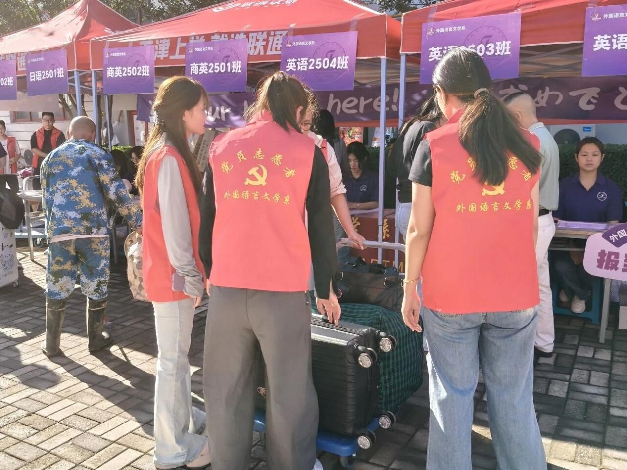 校园里的“红马甲”更是随处可见——志愿者们穿梭在各个角落,主动接过沉重的行李,细致解答关于教学楼位置、食堂口味的各种疑问。一句句真诚的“欢迎来到宝德外语系”,一个个灿烂的微笑,让秋日的校园充满了家的温度。