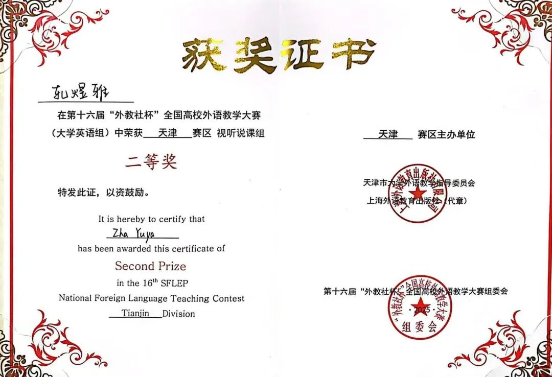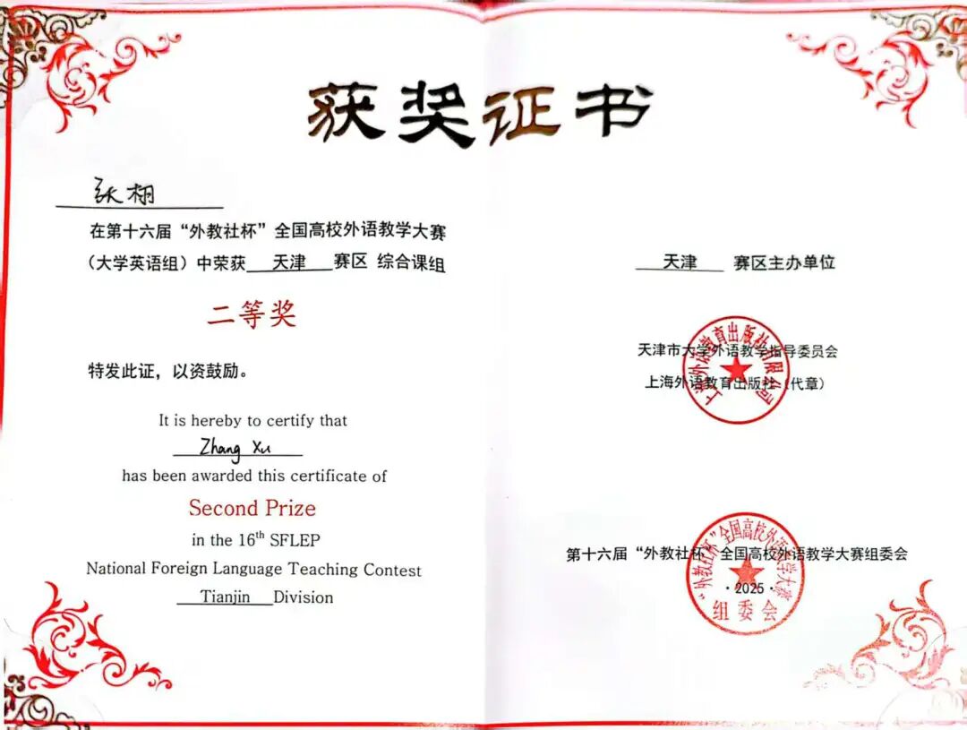 近日,2025年第十六届“外教社杯”全国高校外语教学大赛天津赛区(大学英语组)比赛结果正式揭晓。我系张栩、轧煜雅两位教师凭借出色的教学表现,分获综合课组和视听说课组天津赛区二等奖,充分展现了我系教师扎实的教学功底与卓越的创新实力。