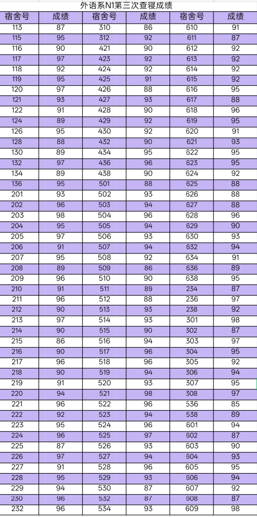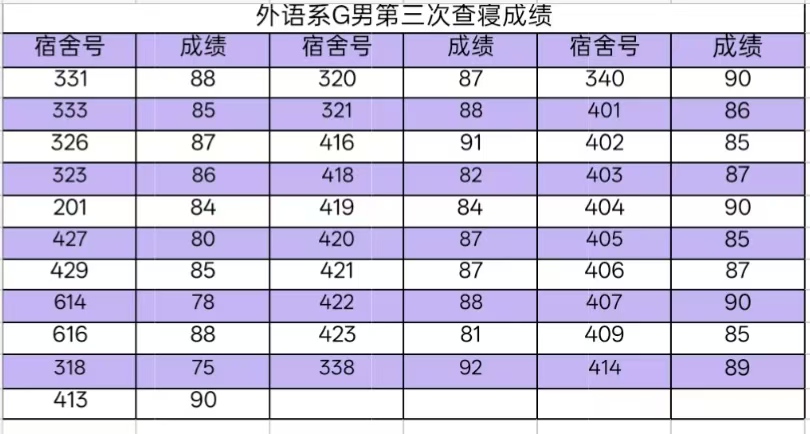 寝分公示栏 | 创建文明宿舍:外语系第三次宿舍评分情况
