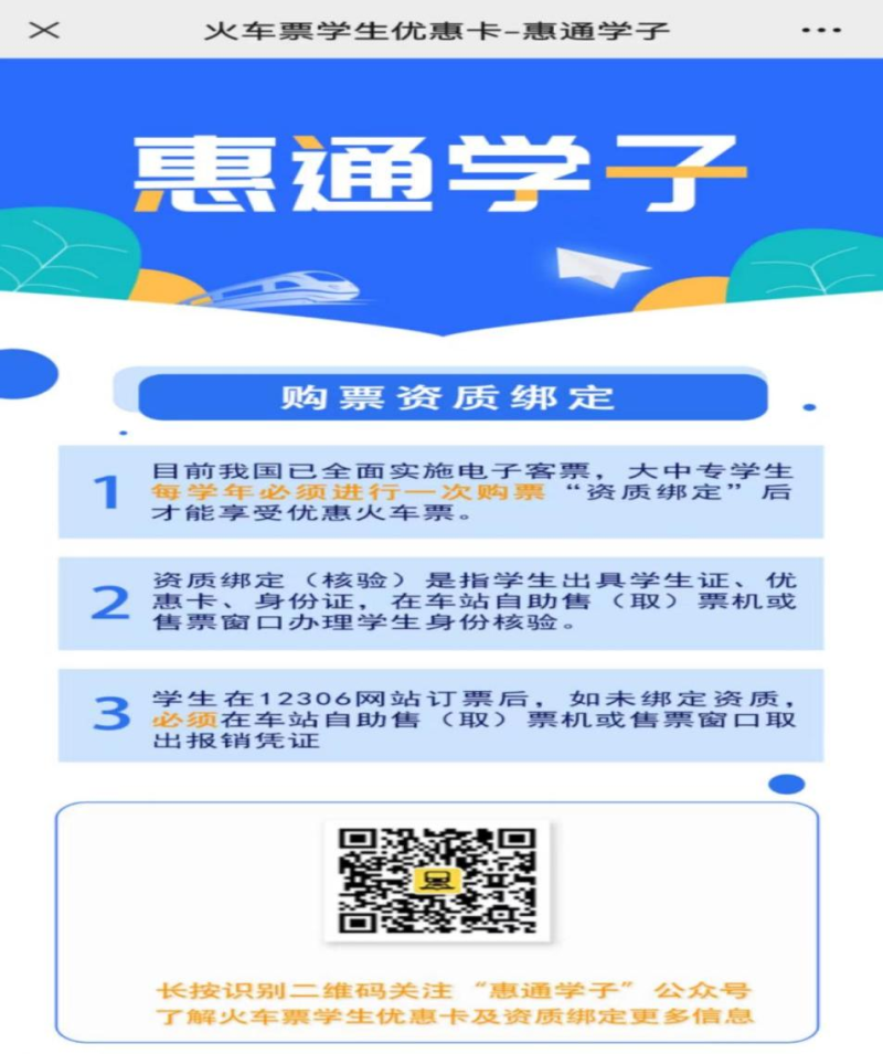第一步:扫描火车票学生优惠卡上的二维码,关注惠通学子公众号。