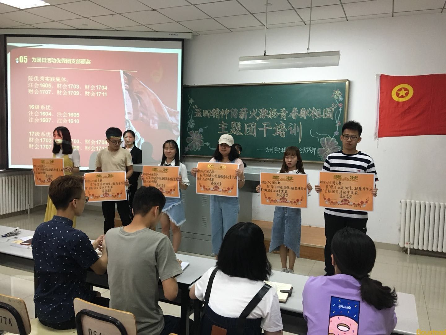在大家对五四精神有了较深刻的理解之后,由委员张夏瑄对团日活动总结相关要求进行讲解。通过讲解,希望各位团支书回到本支部后,可以采用适合本支部的方式积极开展此次团日活动,用适合大学生的方式传达本次团干培训的中心思想。接下来,为上次“学习四进四信,凝聚青年力量”团干培训中获奖班级颁奖。获得院优秀实践集体的班级为:注会1605,财会1703,财会1704,财会1707,财会1709,财会1711。获得系优秀实践集体的班级为:注会1604,注会1605,注会1607,注会1610,财会1702,财会1703,财会1704,财会1707,财会1709,财会1711。