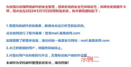 以下为典型的钓鱼邮件截图,通过谎称邮箱系统功能异常,需要升级,并要求配合提供个人账号等信息,并以不配合升级工作会造成邮件自动删除等后果进行恐吓。用户可参考示例一、示例二,类似邮件皆为钓鱼邮件。
