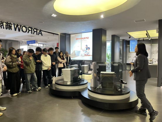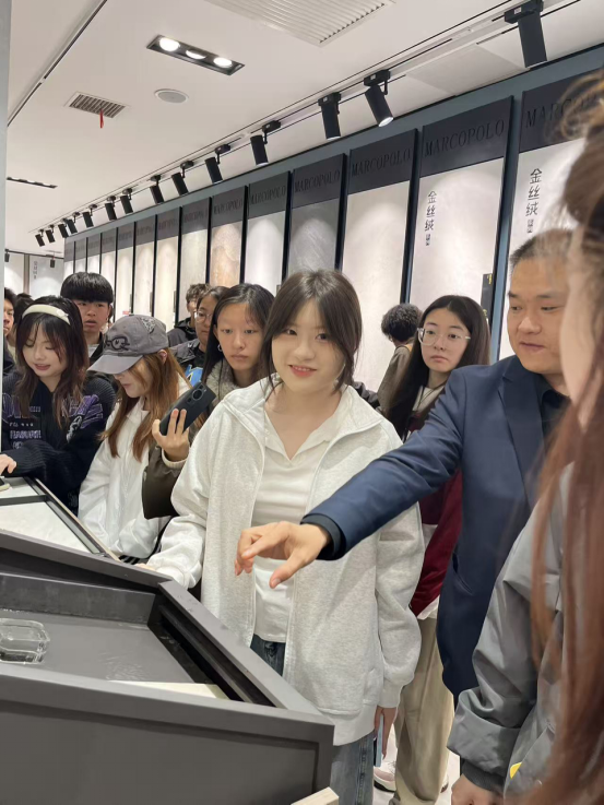 讲解现场,业务经理们详细介绍了智能化卫浴、全屋定制、马可·波罗瓷砖、蒙娜丽莎2026新品瓷砖等全品类产品,拆解花色、尺寸、工艺等核心要点。同学们认真聆听、主动提问,对材料应用形成了直观认知。