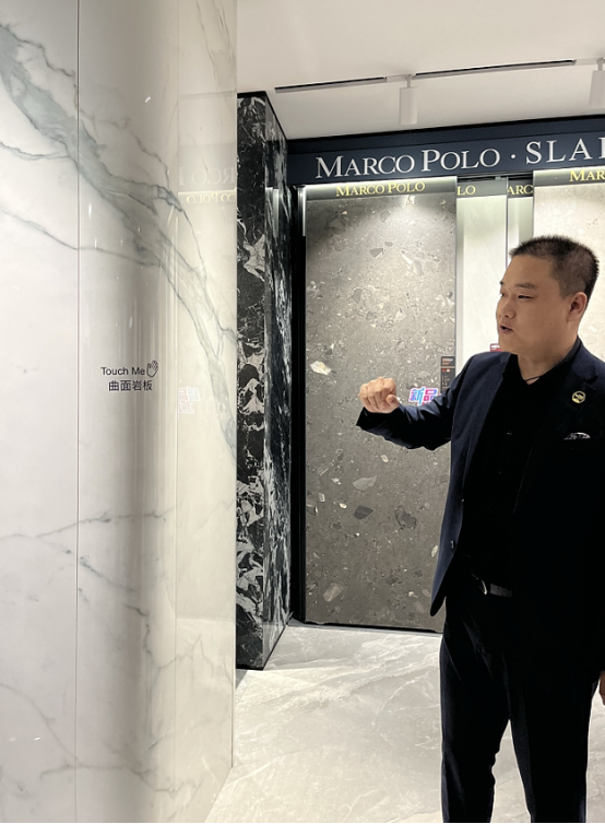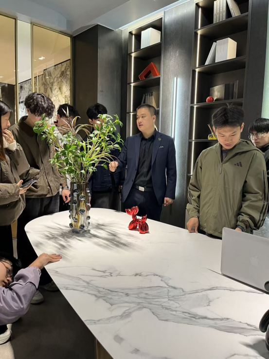 岩板最新工艺展示尤为吸睛,业务经理现场讲解演示超薄岩板、曲面岩板的核心工艺及应用,让同学们直观了解材质优势与施工技巧,深刻体会材料工艺对设计落地的重要性。