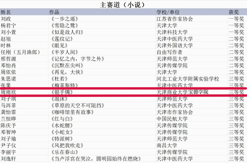 12月27日,由天津市写作学会、天津师范大学文学院联合主办的“笔底波澜·时代回响”创意写作作品征集活动圆满收官。历经征集、多轮评审与严格筛选,其中,天津商业大学宝德学院2025级戏剧影视文学专业的周雨欣同学凭借原创微型小说《银手镯》(指导老师:彭静),成功获得赛事三等奖。