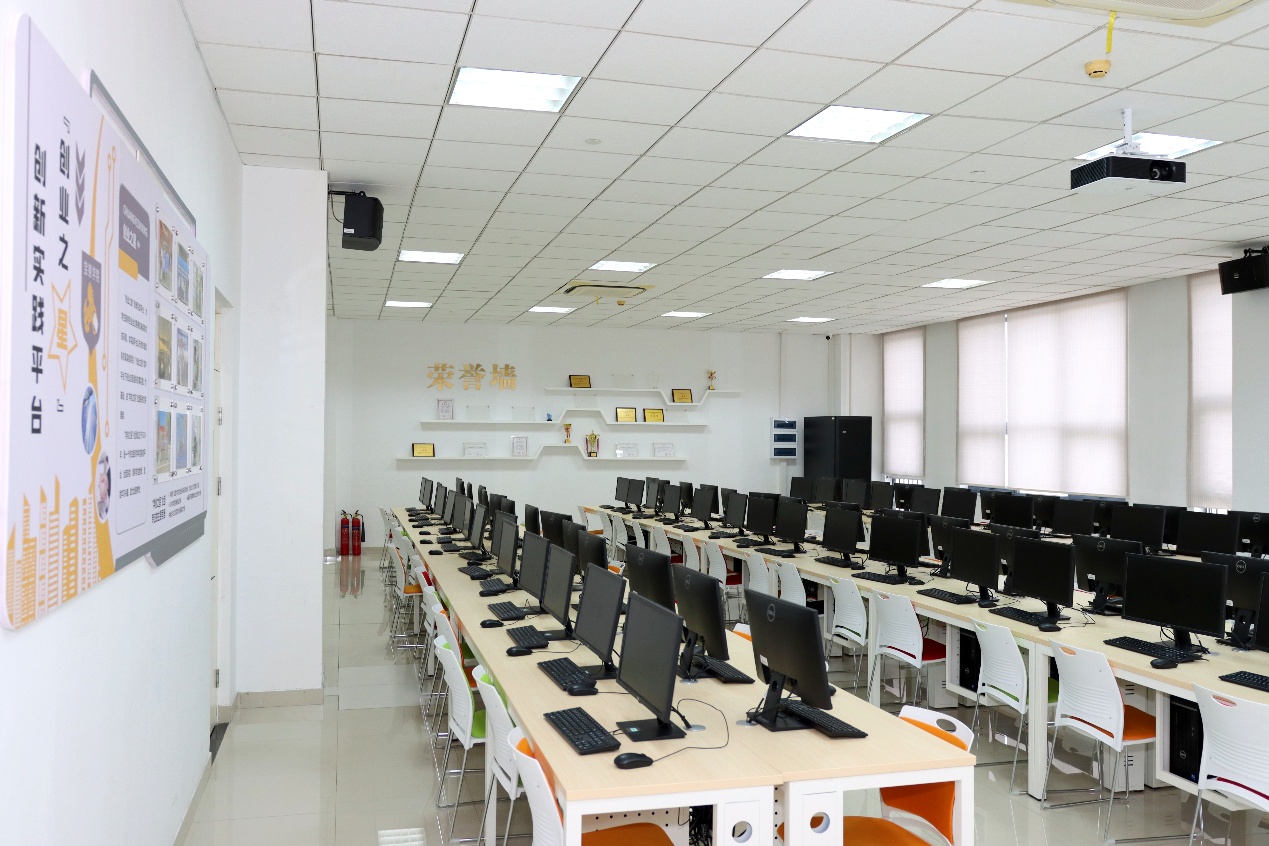 创新创业虚拟实训空间实验室位于主楼十层1012-1014教室,于2022年建成,配备85台电脑,可容纳两个教学班同时上课,承担工商管理系《创业模拟实训》课程。通过3D电子仿真软件,让学生在游戏化场景中学习企业从创建、研发、生产到销售的全过程经营实践,在商业竞争中激发学习热情和积极性。